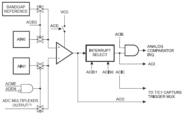 Der Analog Comparator vergleicht die Spannungen am positiven Eingang Pin AIN0 und am negativen Eingang Pin AIN1 miteinander. Wenn die Spannung am positiven Eingang größer als die am negativen Eingang ist, wird der Analog Comparator Output (ACO) auf 1 gesetzt. Der ACO kann den Timer/Counter1 Interrupt oder einen eigenen ACO Interrupt triggern, der nur für den Analog Comparator vorgesehen ist. Der Anwender kann auswählen, ob der Interrupt mit der steigenden oder fallenden Flanke des ACO oder durch einen Zustandswechsel des ACO getriggert wird. Das Blockdiagramm mit der dazugehörigen Logik zeigt das nachfolgende Bild.