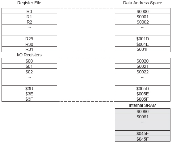 Die 1120 Zellen des Datenspeichers enthalten die 32 Register, den I/O-Speicher und den eigentlichen internen SRAM-Datenspeicher. Die ersten 96 Zellen adressieren die Register und den I/O-Speicher, die anderen 1024 Zellen den Datenspeicher.