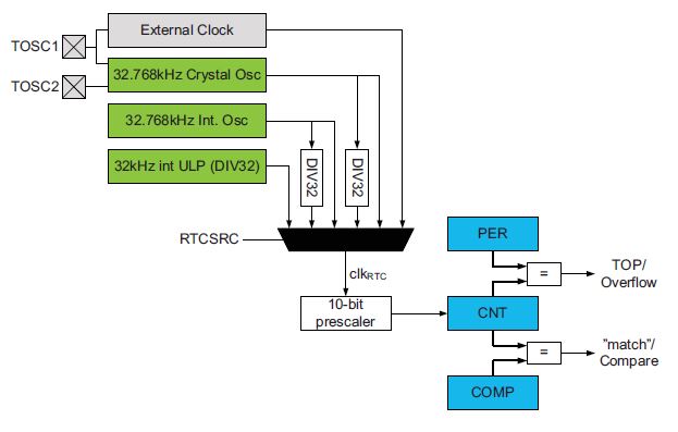 Der RTC beinhaltet einen 10 Bit Vorteiler mit dem der Takt heruntergeteilt werden kann bevor er auf den Zähler geführt wird. Somit kann eine große Spanne von Auflösungen oder Perioden erreicht werden.