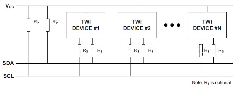 Das TWI ermöglicht eine einfache, bidirektionale Kommunikation über zwei Leitungen, die serielle Taktleitung (SCL) und die serielle Datenleitung (SDA). Die beiden Leitungen sind open collector (wired AND) daher sind zwei pull up Wiederstände die einzigen externen Komponenten, die benötigt werden. Die beiden Widerstände sorgen für H-Pegel auf den Leitungen, der Low-Pegel kommt von den angeschlossenen Bausteinen.