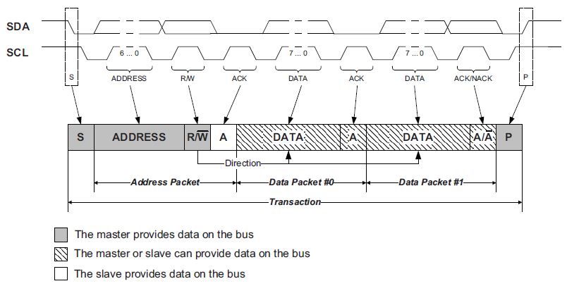 Ein Master beginnt eine Übertragung indem er eine START Bedingung (S) auf dem Bus ausgibt. Danach wird das Adresspaket auf dem Bus ausgegeben. Es enthält die Adresse (ADRESS) und ein Bit, das angibt, ob der Master Daten lesen oder schreiben will (R/W). Nachdem alle Daten (DATA) gesendet wurden, beendet der Master die Übertragung mit einer Stop Bedingung (STOP). Der Empfänger muss jedes empfangene Byte bestätigen (A) oder nicht bestätigen (/A).