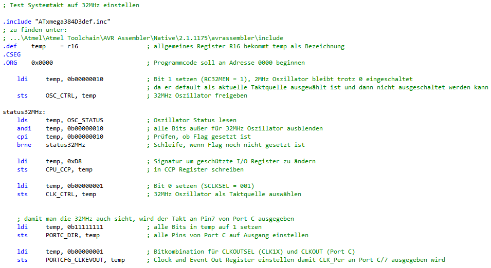 Erzeugt einen präzisen 32MHz Takt, der bei der Produktion kalibriert wird. Zwei Kalibrierungswerte werden beim Reset automatisch aus der Signatur Row in die Kalibrierungsbytes DFLLRC32M_CALA und DFLLRC32M_CALB geschrieben. Die digital frequency loocked loop (DFLL) kann dann freigeschaltet werden um den Oszillator zur Laufzeit zu kalibrieren.