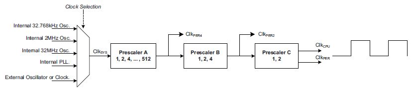 Der Systemtakt wird auf eine Kette von drei Vorteilern geführt. Teiler A teilt zwischen 1 und 512, Teiler B zwischen 1 und 4 und Teiler C durch 1 oder 2. Zwischen den Teilern A/B und B/C werden die Peripheren Takte clk_PER4 und clk_PER2 abgegriffen. Am Ende der Teilerkette stehen die Takte clk_cpu und clk_PER zur Verfügung.