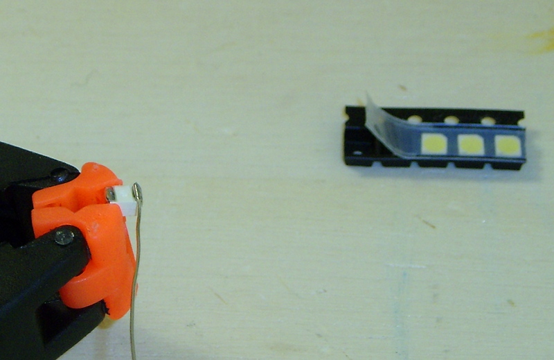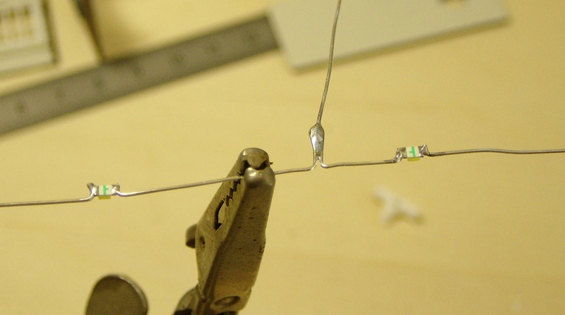 Für das Untergeschoss reicht eine LED aus. Hier kommt eine LED (LW T673 bei Reichelt) mit gelblichen, also warmen Farbton zum Einsatz. Als Widerstand habe ich zunächst 500 Ohm (zwei 1k parallel) genommen. Die Kontaktflächen sind groß genug, um einen Silberdraht anzulöten.