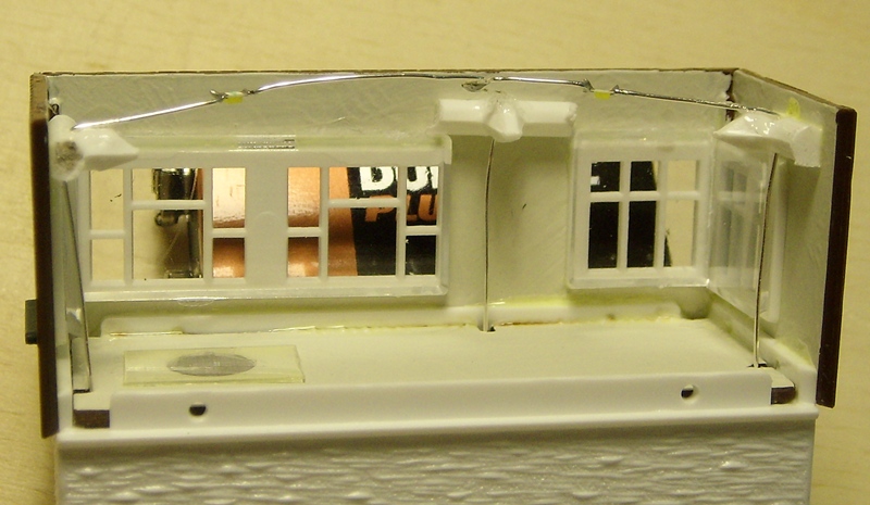 Der Innenraum des Stellwerks ist aber noch komplett leer. Das sieht hinterher auf der Modellbahnanlage nicht besonders gut aus, erst recht nicht, wenn die Beleuchtung eingeschaltet ist. Aus ein paar kleinen Leisten baue ich noch ein "Stellpult". Zusätzlich kommen zwei Mann als "Stellwerk-Besatzung" in den oberen Raum.