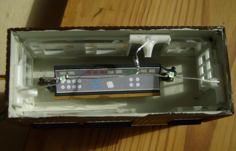 Nachdem die Drähte angelötet und die Lampenhalter angeklebt sind, kann die Innenbeleuchtung schon montiert werden.