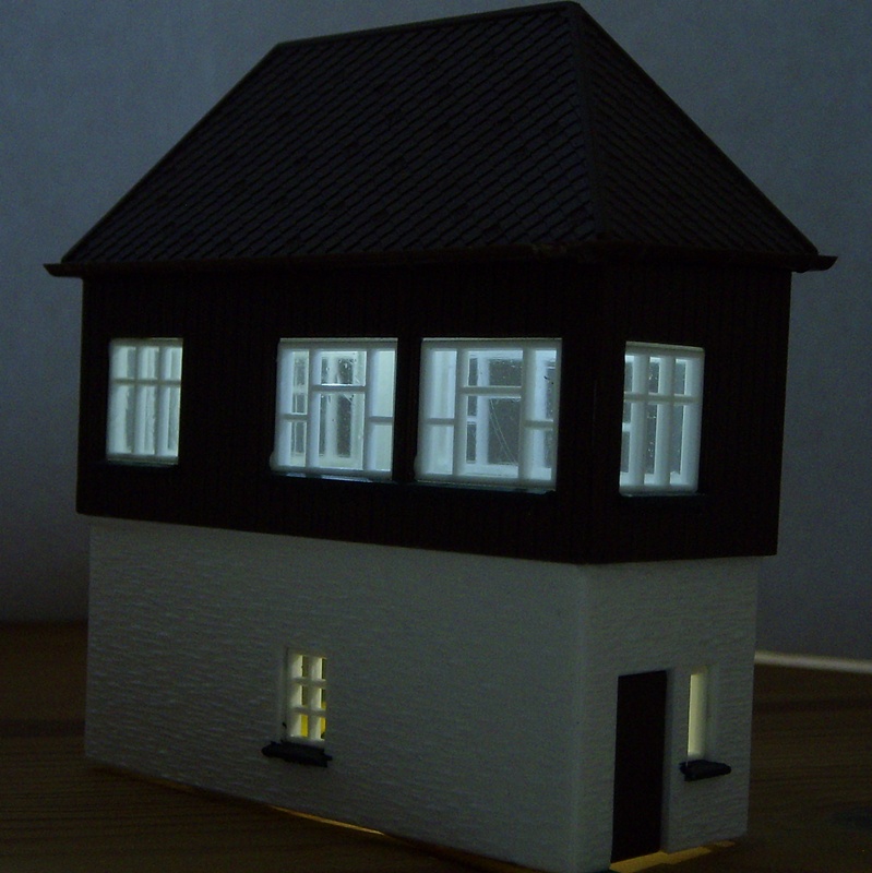 Das Obergeschoss des Stellwerkes ist auf Grund der großen Fenster von außen gut einsehbar. Hier kommt eine Beleuchtung mit zwei LEDs in Frage. Die LEDs dürfen einen etwas bläulicheren Farbton haben, das kommt eine Beleuchtung mit Leuchtstoffröhren sehr nahe. Die LEDs (LED 0805-600 WS bei Reichelt) erhalten einen gemeinsamen Masse-Anschluss. Als Widerstand kann pro LED 3,3kOhm oder mehr genommen werden, weil sie sehr hell leuchten.