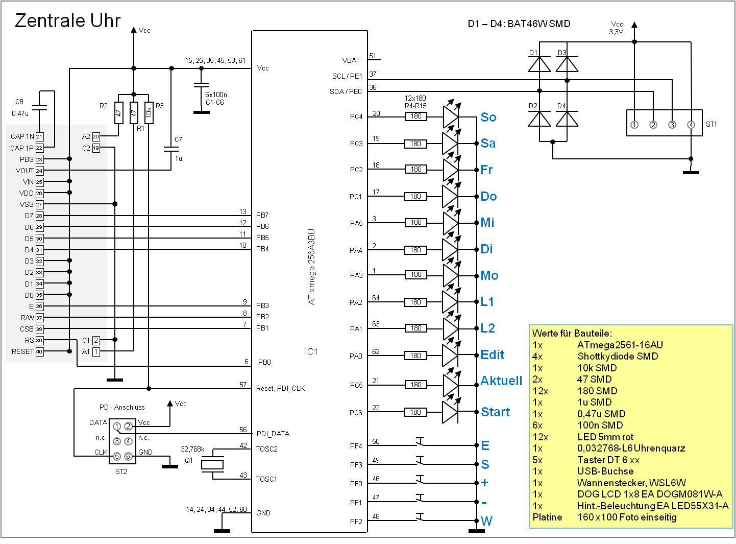 Dieses Modul zeigt auf einer 8-stelligen Anzeige die aktuelle Systemzeit an (Std:Min:Sek). Der aktuelle Tag wird durch eine entsprechende LED signalisiert. Die Startzeit, also die Zeit, mit der die Uhr nach dem Einschalten der Betriebsspannung beginnt, und der Zeitrafferwert können ebenfalls angezeigt werden.